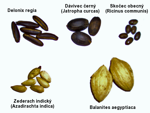 Prvním druhem je více než 5 metrů vysoký dávivec černý (Jatropha curcas) z čeledi pryšcovitých (Euphorbiaceae), který pochází ze střední Ameriky, ale byl zavlečen i do Afriky a Asie. Jeho semena obsahují až 30 % oleje, který se dá téměř bez úprav použít v nádrži spalovacího motoru. Další alternativou je až čtyřicetimetrový zederach indický (Azadirachta indica) z čeledi Meliaceae, který roste v tropických oblastech Starého světa. Oba stromy jsou odolné vůči suchu a daly by se pěstovat i v místech, která se nedají využít k produkci zemědělských plodin.