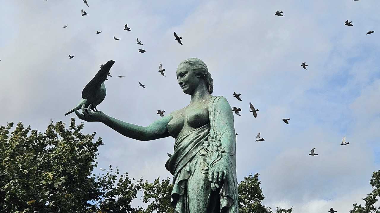 V parčíku v centru Bruselu, na rue Locquenghien (doufám, že tuhle směs francouzštiny s vlámštinou vyslovuju správně) stojí pozoruhodná socha. Krásná spoře oblečená dívka v nadživotní velikosti drží v natažené ruce velkého ptáka a zamilovaně na něj hledí. Pták má roztažená křídla, je jasné, že za okamžik vzlétne a jako správný poštovní holub doručí zprávu tam, kam má.
