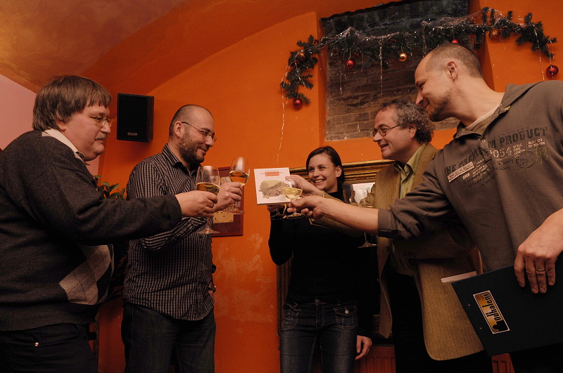 No a pak už doopravdy došlo na křest šumivým vínem a spoustu přání všeho nejlepšího. Ale pozor, knížku jsme nepolili, protože takhle se ke knihám nechováme... Jenom jsme si s Proč nehladit ježka všichni ťukli a bylo to. Těch přípitků bylo potom ještě víc, protože jak už jsem napsal, slavily se i narozeniny prvního gorilího mláděte v pražské zoo. Takže Mojo: "Na zdraví!"