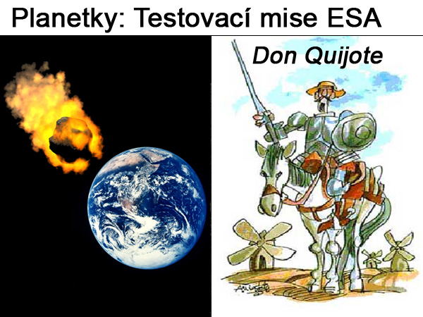 Evropská kosmická agentura ESA přišla s velmi ambiciózním projektem, který se týká výzkumu planetek. Vybrala ho ze šesti různých variant toho, jak by se daly studovat planetky, které křižují zemskou dráhu. Právě z tohoto hlediska je projekt s názvem Don Quijote velice pozoruhodný a myslím, že je to jeden z nejtěžších projektů, které ESA připravila, protože má za cíl navštívit některou vybranou planetku a studovat ji zblízka, ale zároveň se pokusit o její vychýlení z dráhy.